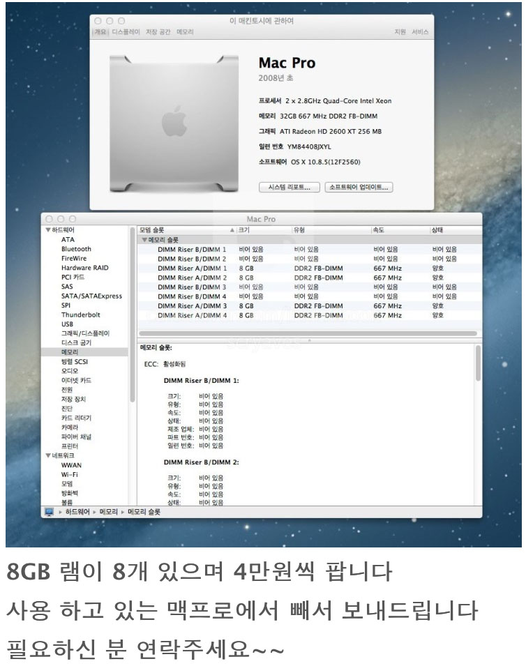 [판매완료] 맥프로용 8기가 램 -8기가 메모리를 팝니다