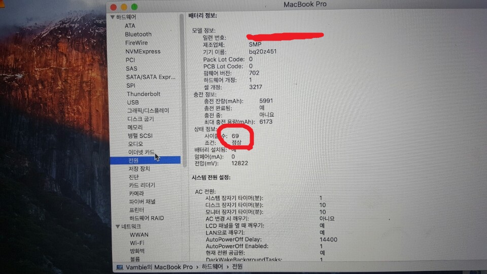 배터리 사이클 69. 맥을 처음써봐서 충전기를 꽂아두고 써야되는지 모르고