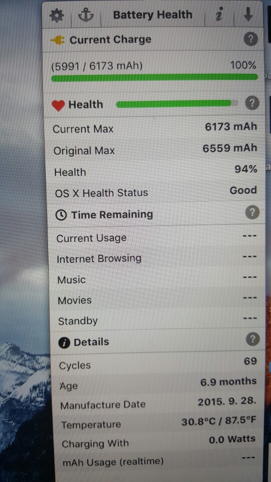 휴대하면서 쓰다보니 사이클이 69가 되었음. 배터리 헬스 94% 나옴.