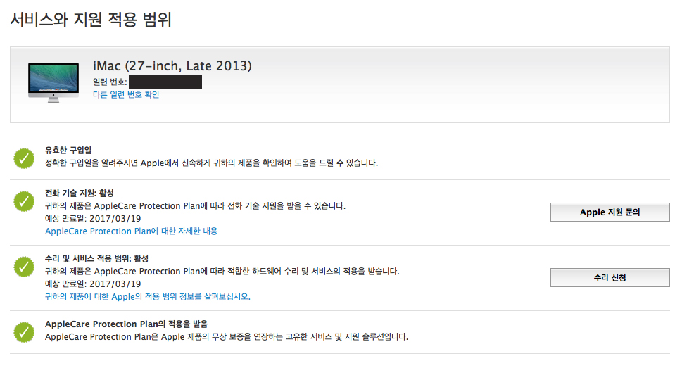 사진으로 확인되듯, 애플케어는 2017년 3월19일까지구요.