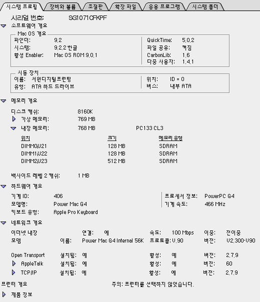 G4/466기종에 768MB RAM이 내장되어있습니다.하드용량은 내장하드선택후 정보입수(커멘드/I(아이))에서 확인하시면 됩니다.