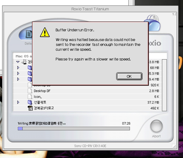 os 9.2에서  toast 5.2쓰고있는데요~ 데이타좀 구울려고 했더니~ 계속 오류네요~ 지금 벌써 씨디 3장째인데~~ 방법 좀~~부탁그립니다.