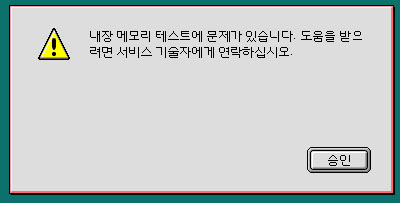 하지만 간혹 메모리의 접촉 상태가 좋지 않은 경우에 상기 메시지가 나오는 경우도 있을 수 있으니, 본체의 전원을 끈 상태에서 메모리를 슬롯에서 빼낸후에 메모리 하단의 금속면을 부드러운 천 등으로 한 번 닦아주신 후에 다시 슬롯에 메모리를 장착하신 후에 매킨토시의 전원을 넣으세요.
