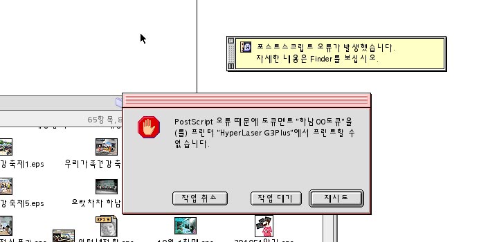 선택자에서 사용하는 adobe ps에 버전이 낮아도 이런문제가 생깁니다.(8.5.1 버전 사용시) 그래서 adobe ps에 버전을 올려서 선택자에서 레이져라이터8 또는 adobe ps를 선택하고 우측에 하이퍼레이져 프린터를 더블클릭해서 PPD셋팅만 하시면 됩니다.(레이져라이터8로 출력하셔도 됩니다.) adobe ps 8.7를 아래 링크에서 다운받으세요. http://www.tomatomac.com/?doc=bbs/gnuboard.php&bo_table=mac_souce_program&sselect=wr_subject%7Cwr_content&stext=8.7&soperator=0&page=1&wr_id=1118 =========== 맥A/S,맥구입 또는 인텔맥에 윈도우XP 설치가 필요하시면 위에 (베스트맥-A/S,판매)아이디를 클릭하고 자기소개를 참고해 주세요.