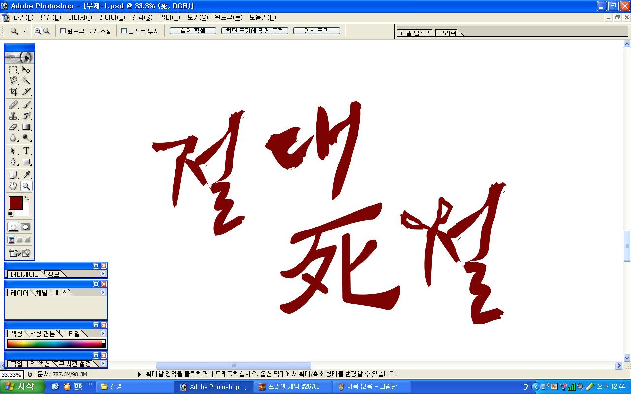 정중히 캘리 부탁드립니다. -_- 류재철 일반 0 5379 2009.11.16 11:18 실력자 분들이 많이 계셔서 이렇게 염치없게 부탁드립니다. - 절대死절 : 첨부한 파일 참고해주시면 감사하겠습니다.(약간 거친느낌? ^^;;) : '절'자의 ㅈ은 가위로...^^;; : 포스터 제작용이라 ai 파일이 필요합니다. 대학동아리 연극공연 포스터로 쓸 예정입니다. 비상업적인 공연이라 이렇게 부탁드립니다.