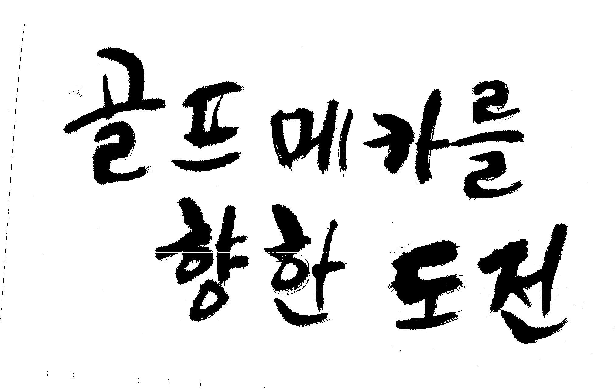 우경의 행복한 캘리세상-골프메카 김철호 일반 0 8300 2009.07.18 10:26 > > 리듬감을 최대한 살리고 ㅡ 스포츠의 운동감과 밝음 > 기교섞인 획을 배제--일반적인 느낌 > 굵기변화를 통하여 도전 낱말을 강조 > 스타일은 비슷하지만 ...한 사람이 썼으니까 ㅎㅎㅎ > 서로 다른 글꼴을 올린 것은... 비교하여 보시고... > 편집자에게 선택권을 주는 것입니다 >
